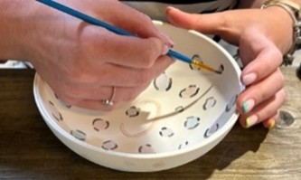 Onder leiding van Greetje Schots gaan we keramiek beschilderen met glazuur dat daarna wordt afgebakken.